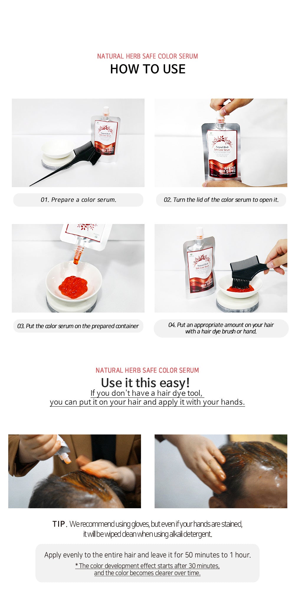 This liquid-type herbal color serum allows easy, gentle coloring without mixing two agents. Simply apply, leave for 30 minutes, and rinse with water—no shampoo needed. A quick 3-minute hand scrubbing helps the pigment coat evenly, delivering smooth and natural-looking color.
