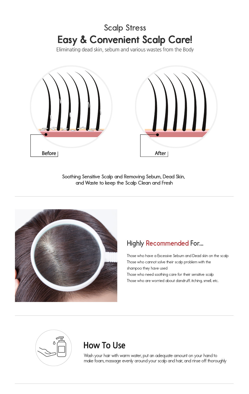 Wet hair with warm water, apply an adequate amount, massage gently into the scalp and hair to create foam, then rinse thoroughly.