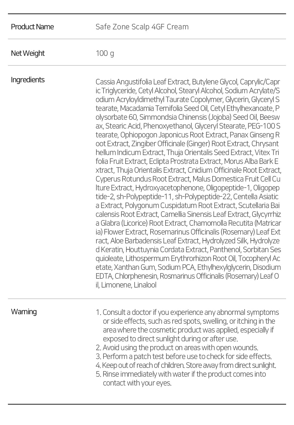 SAFE ZONE SCALP 4GF CREAM delivers professional scalp care at home. Four powerful growth factors work together to strengthen the scalp's natural barrier, improve elasticity, and enhance overall scalp health. Consistent use helps maintain a fresh, nourished, and resilient scalp.