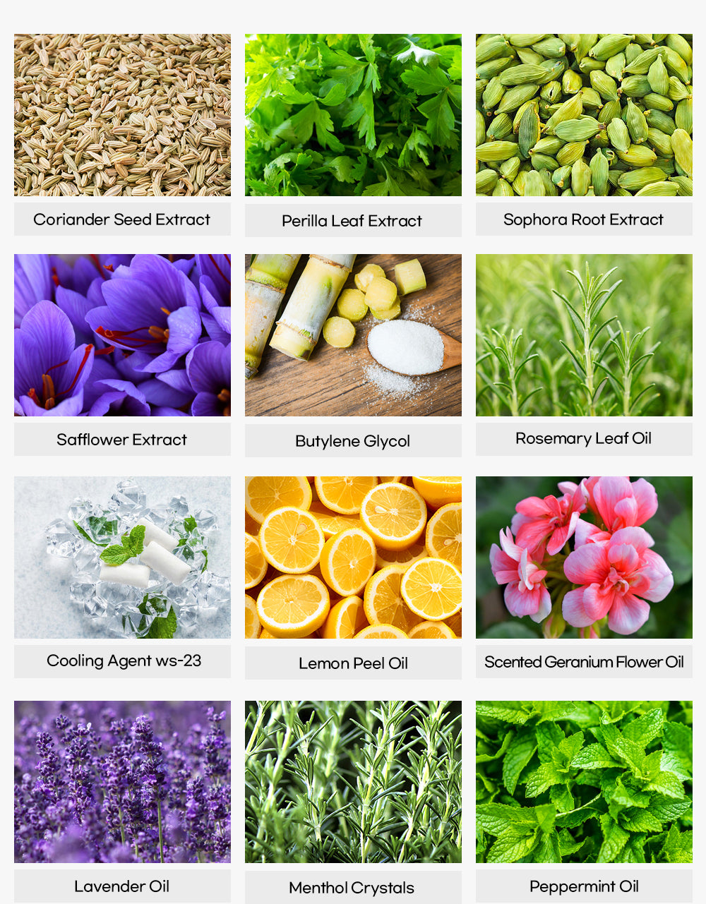 - WS-23 Cooling Agent & Lemon Peel Oil: Deliver a long-lasting icy sensation